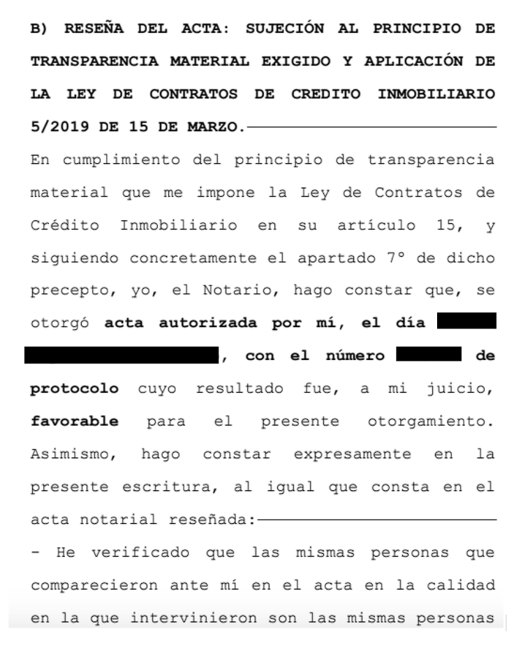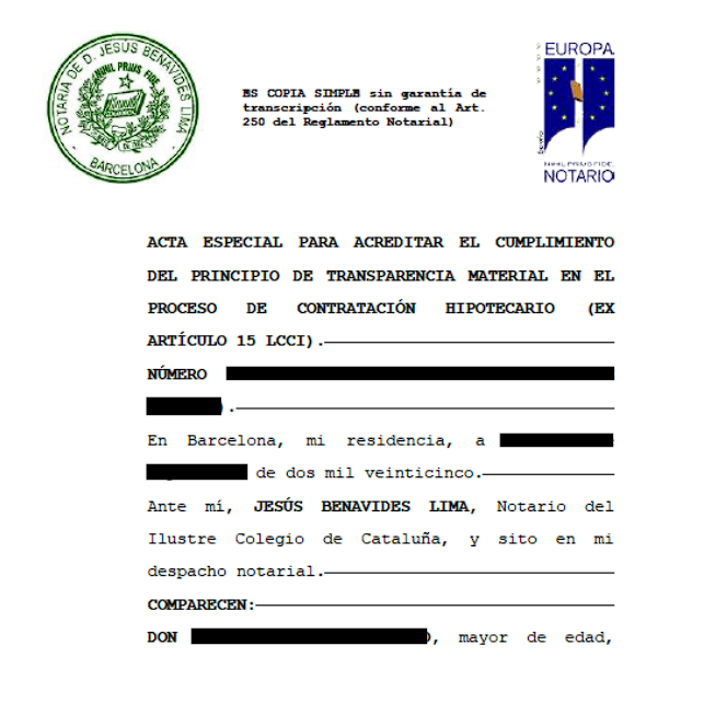 <ejemplo>A la vista de ello, en este caso, Anna y Pere, antes de poder firmar sus escrituras de compra y préstamo hipotecario, deberán acudir previamente al Notario para firmar su acta de transparencia material, para así verificar que su operación cumple con todos los requisitos que exige la Ley, y asimismo, para asegurar que están adecuadamente informados sobre todas las características y particularidades del préstamo hipotecario que formalizarán en breves.<ejemplo>