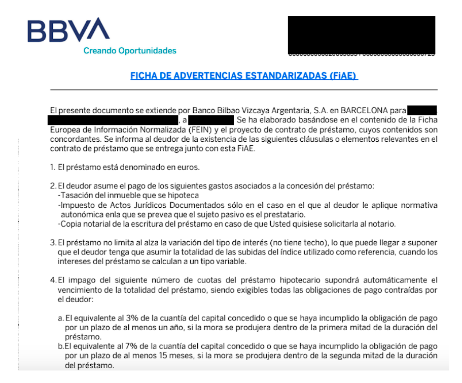 La FIAE, o Ficha de Advertencias Estandarizadas, es otro documento que la entidad acreedora deberá entregar al cliente, debiéndolo firmar ambas partes, en el que la Ley reguladora de los contratos de crédito inmobiliario obliga a la entidad acreedora a informar al prestatario o potencial prestatario de la existencia de las cláusulas o elementos más relevantes del contrato, con especial referencia a: