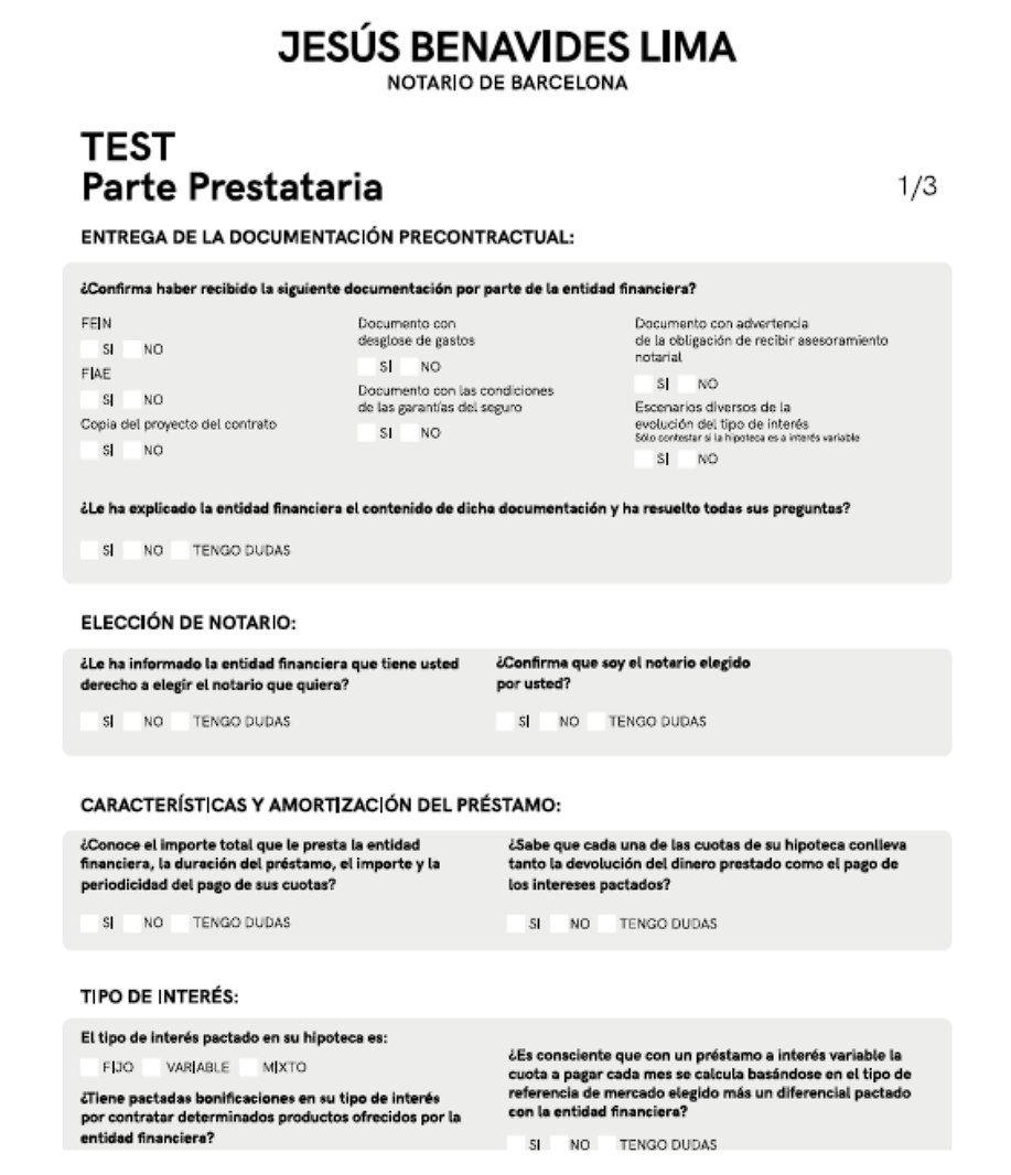 - Además, para asegurar que el deudor ha comprendido adecuadamente todas las características fundamentales de su préstamo, en la Notaría se le facilitará un test, que deberá contestar, para así verificar que su comprensión de la operación se adecúa a la realidad y características de la misma.